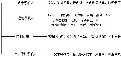 電動及氣動進退膛電視監(jiān)視裝置,在冷卻風出現(xiàn)斷風故障時,能自動將潛望鏡管退出爐膛,以免燒壞輸象系統(tǒng),操作人員也可在控制室內(nèi)通過控制盤上的操作按鈕或電腦控制潛望鏡管的進退爐膛。