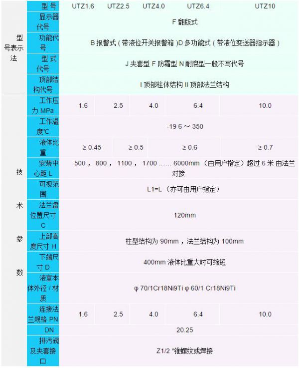 標(biāo)記示例 :UTZ6.4F-BJ-----磁浮翻板式液位計(jì)工作壓力 6.4MPa ,高低位報(bào)警夾套型